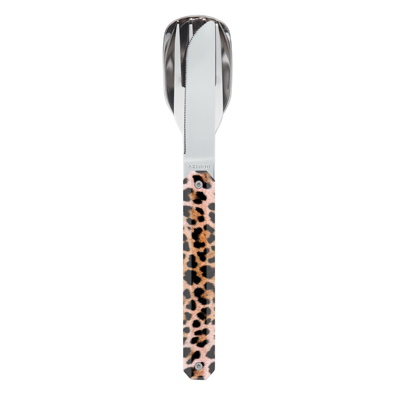 Akinod Feststehendes Besteck 12h34 poliert, Leopard. Besteck aus martensitischem Edelstahl 2CR14, hochglanzpoliert. Bestehend aus einem großen Löffel, einer 4-zahnigen Gabel und einem Messer mit einer mikroverzahnten Klinge. Dekorierter, transparenter Polymer (PC)-Griff. Fixierung mittels verbautem Magnet. Geliefert mit einem Trageetui aus Hartpolypropylen (PP). Spülmaschinenfest.