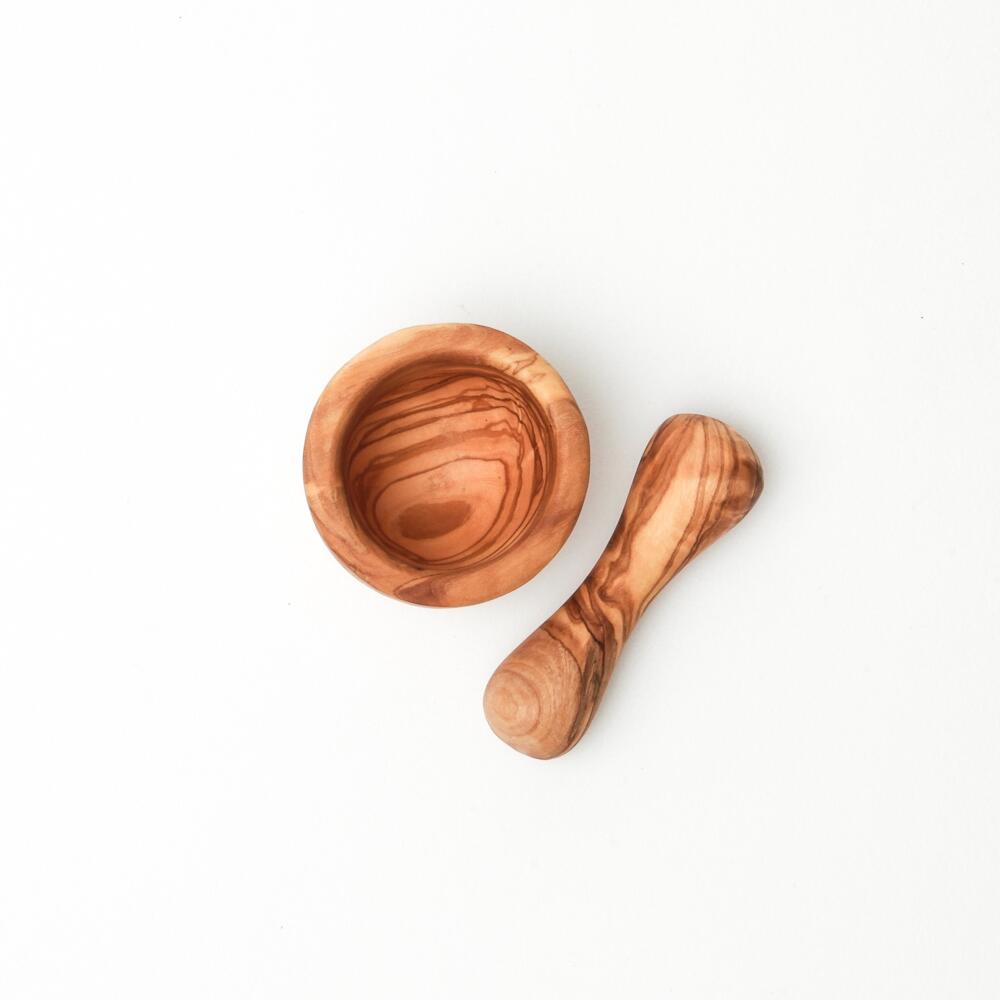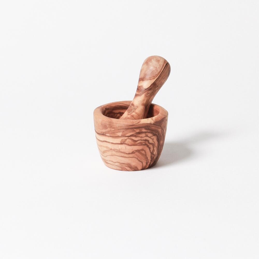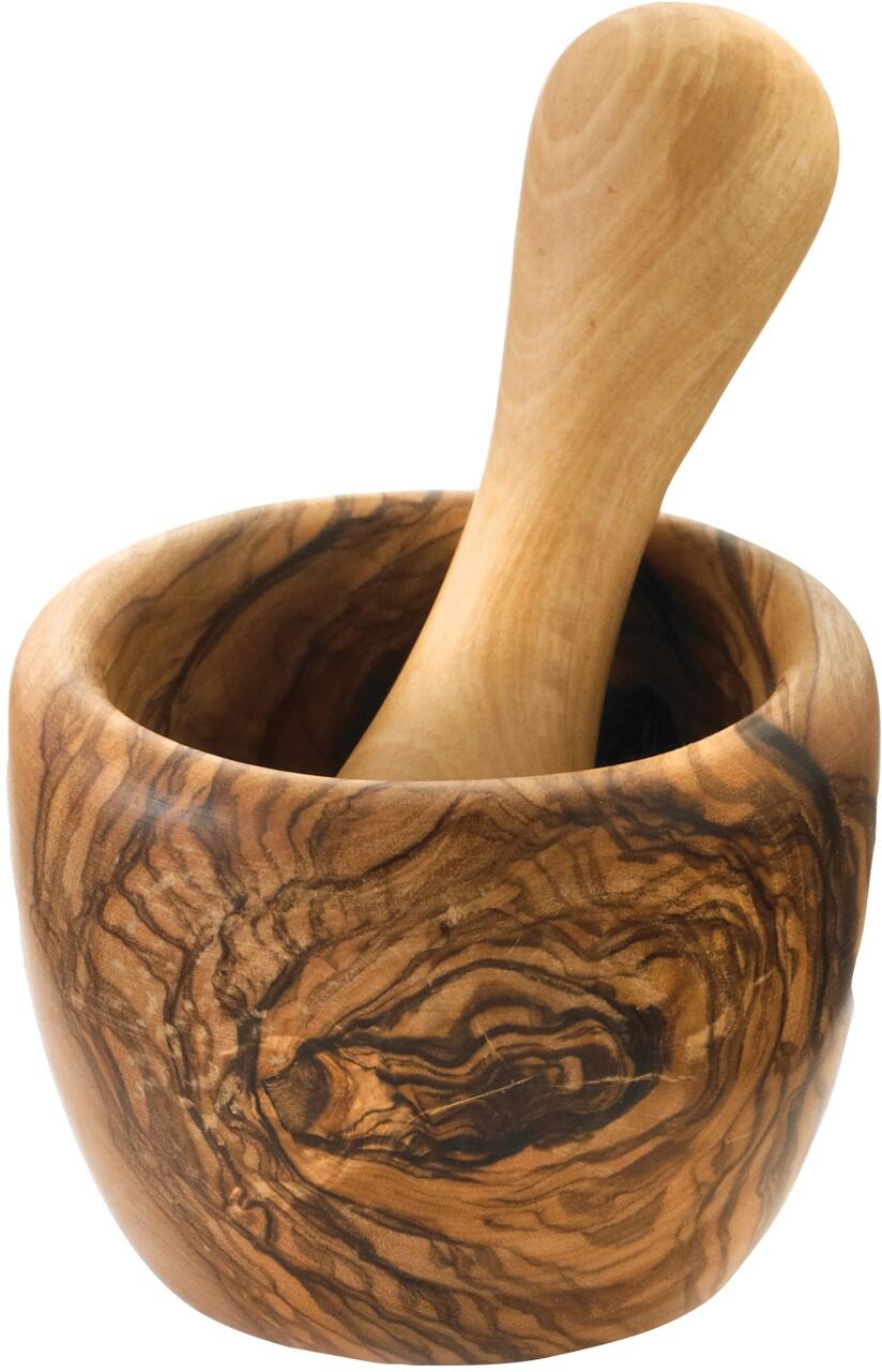 Bérard Mörser mit Stößel, klein mit 7 cm Durchmesser. Das widerstandsfähige Olivenholz eignet sich optimal zum Mahlen und Zerkleinern von Gewürzen und Kräutern.