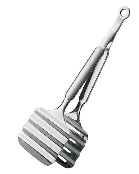 Fisch- und Spargelzange von Rösle. Die Rillen der breiten Auflagefläche greifen Fisch, Spargel oder anderes längliches Gemüse sanft ohne es dabei zu knicken.