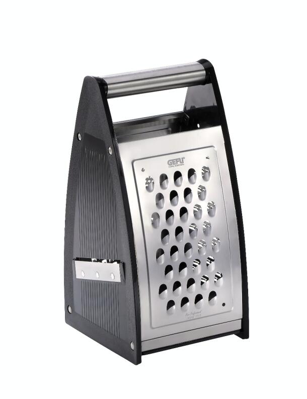 Scharf geschnitten! Die Vierkantreibe garantiert hohe Effektivität. Sie ist extrem scharf und liefert mit den 4 verschiedenen Reibflächen – feine und grobe Reibfläche, eine Raspel, sowie einen Hobel - ein optimales Reibergebnis. Die besondere Schärfe wird durch das LASER CUT Verfahren gewährleistet. Verschließbarer Boden.