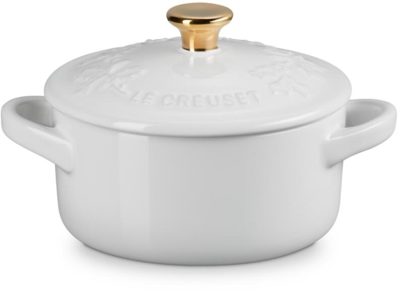 Le Creuset Mini Cocotte Holly in white. Vielfältig einsetzbares Serviertöpfchen für herzhafte und süße Speisen im weihnachtlichen Design.