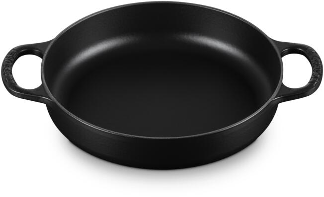 Die spezielle Le Creuset Innenemaillierung der Gusspfannen ist aus schwarzem Emaille. Diese sorgt dafür, dass man beim Braten nur wenig Fett benötigt, scharfes Anbraten auch ohne Ankleben gelingt und die Reinigung der Gusspfanne erleichtert wird.