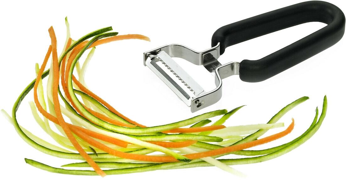 Möhren, Zucchini, Rettich, … - Der Schäler mit japanischer Klingentechnologie besitzt eine Schärfe, die Ihnen aus Gemüse aller Art mit wenigen Handgriffen feine Gemüsestreifen zaubert. Der Klingenkopf ist beweglich, so dass Sie ihn leicht über die unterschiedlichsten Gemüseformen führen können. Die spezielle ausgeformte Klinge hebt die geschälten Streifen vom Gemüse ab und verhindert, dass sie am Gemüse kleben. So können Sie noch schneller und effizienter arbeiten!