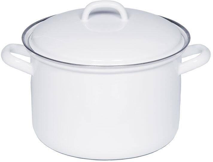 Riess Fleischtopf aus Emaille in weiß. Hoher Kochtopf mit 2 Emaillegriffen, in verschiedenen Größen erhältlich. Der Topf mit hoher Seitenwand verfügt über einen robusten Chromrand und einen Deckel mit Griff.