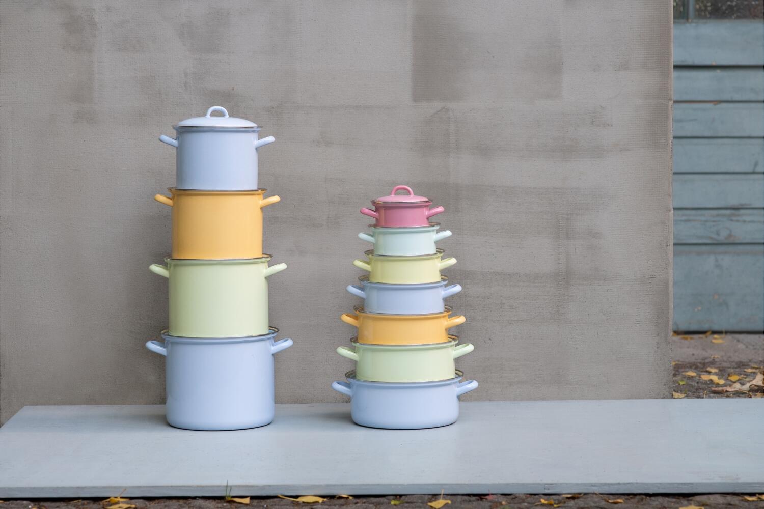 Bei der Pastellfarben-Serie von Riess wird auf buntes Farbenspiel gesetzt. In pastell-blau ist die Kasserolle mit 18 und 24 cm Durchmesser erhältlich, in nilgrün finden Sie die Kasserolle mit 22 cm Durchmesser und goldgelb bildet mit 20 cm den Abschluss der typischen Riess-Pastellfarben. Dazu kommt noch eine kleine Kasserolle in türkis mit 14 cm Durchmesser sowie eine mit 16 cm Durchmesser in pastell-gelb.