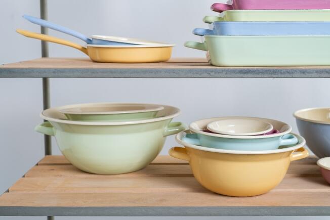 Das besondere Material ist außerdem schnitt- und kratzfest, backofengeeignet und leicht zu reinigen. Emaille ist von Natur aus bakterienhemmend und aromaneutral.