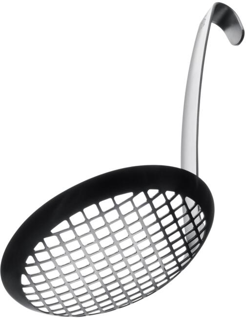 Rösle Schaumlöffel flach, grob gelocht. Der Schaumlöffel von Rösle bringt auch kleine Teile vom Boden nach oben und geht mit empfindlichen Speisen sorgsam um.