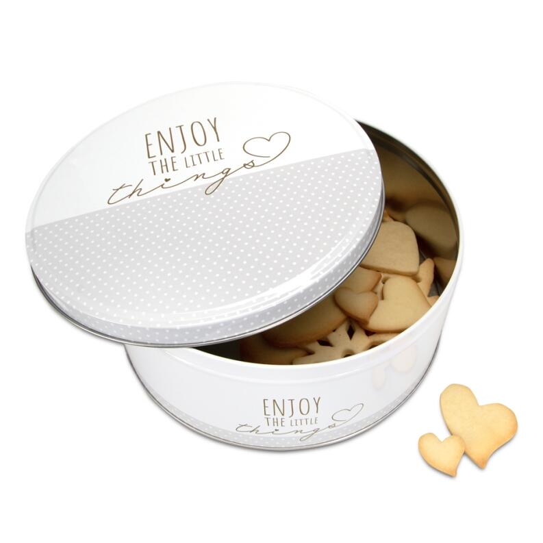 Warum nicht einfach mal die kleinen Dinge genießen! Bei der Gebäckdose „Enjoy the little things“ ist der Name Programm. Die Gebäckdose ist aus Weißblech gefertigt. Sie eignet sich zum Aufbewahren kleiner Kuchen oder Plätzchen, und zum Verschenken kleiner Aufmerksamkeiten. Zur Reinigung warmes Wasser, ein wenig mildes Spülmittel und ein weiches Spültuch nutzen. Nicht in der Spülmaschine reinigen. Nach der Reinigung gut mit einem weichen Küchentuch abtrocken.