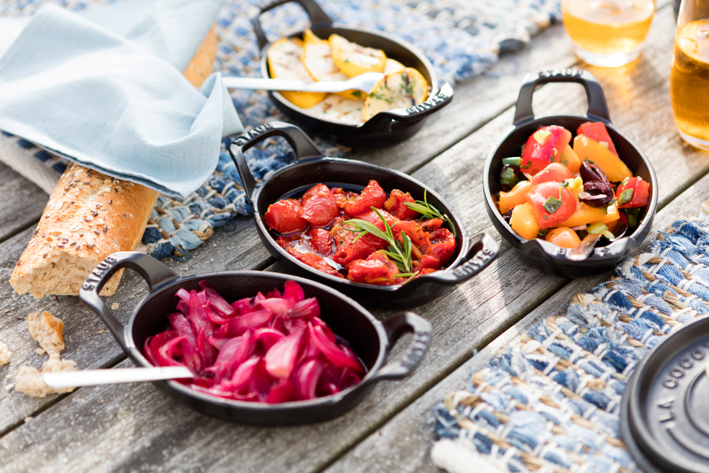 Ideal zum scharfen Anbraten von Fleisch und Gemüse und zum anschließenden Überbacken im Ofen. Die Brat- und Servierpfanne aus Gusseisen von Staub zeichnet sich aus durch eine gleichmäßige Wärmeleitung und eine hervorragende Wärmespeicherung. Einmal erhitzt, bleibt die Gusspfanne lange heiß. Das Bratgut kann selbst bei schwacher Hitze mit niedrigem Energieverbrauch in der Gusspfanne von Le Creuset gebraten werden.