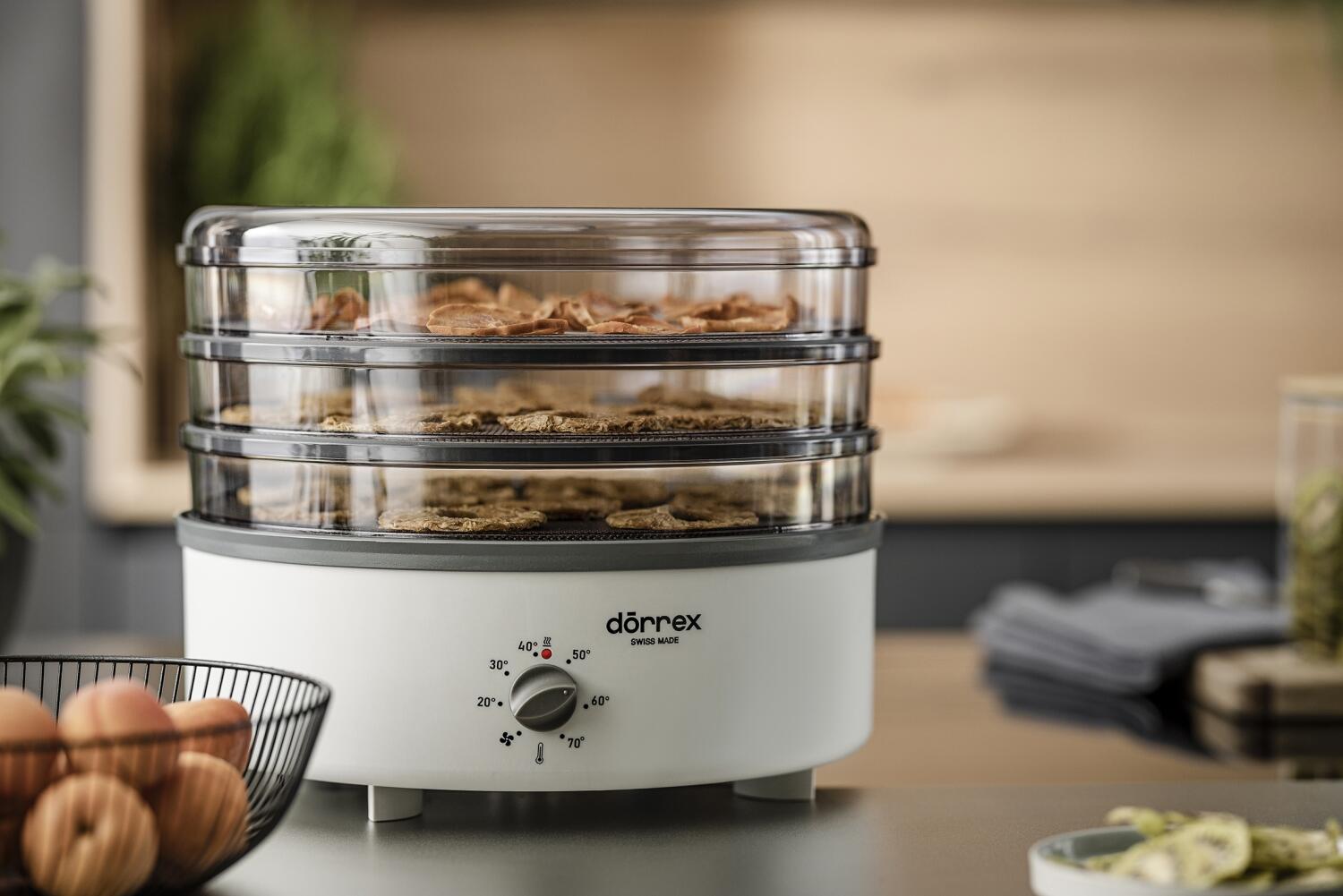 Stöckli Dörrautomat dörrex mit Metallgitter. Dörrgerät mit pflegeleichtem Kunststoffgehäuse, stufenloser Temperatureinstellung und aktiver Warmluftzirkulation. Inklusive drei Metall-Dörrgitter. 230 V, 540 W, BPA-Free, Swiss Made.