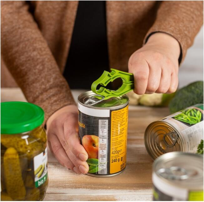 Der Dosenöffner ist ein wahres Multitalent auf seinem Gebiet. Einfach den Dosenöffner am Dosenrand ansetzen und solange an der integrierten Schraube drehen, bis sich der Deckel abheben lässt. Das gehärtete Schneidrad sorgt für einen sauberen Schnitt. Zusätzlich verfügt der Dosenöffner über einen Kapselheber für Kronkorken und mit der Spitze lassen sich Vakuumverschlüsse abheben.