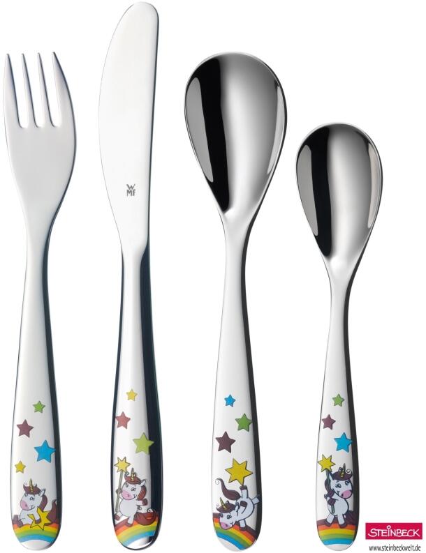 Mit dem Kinderbesteck von WMF lernen die Kleinen spielerisch, mit Messer, Löffel und Gabel umzugehen. Mehr als 125 Jahre Erfahrung stecken in den kindgerechten Besteckteilen aus rostfreiem Edelstahl, die außerdem mit liebevoll gestalteten Motiven und farbigen Bildern begeistern. Das 4-teilige WMF Kinderbesteck, bestehend aus einem Kindermesser, einem großen und kleinen Kinderlöffel sowie einer Kindergabel, zeichnet sich durch ein kindgerechtes Design aus, das die Fähigkeit zum selbständigen Essen verbessert und gleichzeitig für Spaß beim täglichen Essen sorgt. Die Kinderbesteckset sind in entsprechende Altergruppen eingestuft, dieses eignet sich für Kinder ab 3 Jahren. Die Größe und Form dieser Kinderbesteckteile machen dieses Set zum perfekten Erstbesteck für absolute Sicherheit und die Entwicklung der Feinmotorik. Die Größen der Besteckteile und die kräftigen Stiele eignen sich besonders für kleine Hände und die kindliche Motorik. Die Messer haben einen leichten Wellenschliff. Der Laffenrand des Löffels hat abgerundete Kanten, und die kurzen stumpfen Zinken der Kindergabel passen sich kleinen Kindermündern an. Die Besteckteile aus Cromargan Edelstahl 18/10 sind langlebig und können in der Spülmaschine gereinigt werden. Spülmaschinenfestes und säurebeständiges Cromargan garantiert vollen Geschmack, außergewöhnliche Haltbarkeit und eine elegante Ästhetik. Das 4-teilige Kinderbesteck wird in einer hochwertigen Faltschachtel mit Klappdeckel geliefert.