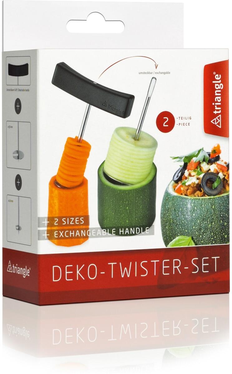 Ob als Appetithappen, Beilage oder Fingerfood - kleine Rohkost-Töpfchen, gefüllt mit einer herzhaften Kräutercreme oder pikanten Pastete, erfreuen Auge und Gaumen gleichermaßen. Mit dem triangle Deko-Twister lässt sich Obst und Gemüse im Handumdrehen in kleine Gefäße verwandeln. Den Handgriff einfach auf die Achse setzen und den Twister gleichmäßig in das Gemüse hineindrehen. Sobald die gewünschte Tiefe erreicht ist, wird das Gerät wieder aus dem Gemüse herausgezogen. Kohlrabi, Zucchini und Gurken eignen sich zum Aushöhlen ebenso wie Karotten, rote Beete oder Rettich. Zwei unterschiedlich große Aufsätze (Ø 20mm, Ø 38mm) sorgen für variable Einsatzmöglichkeiten. Alle Teile sind rostfrei und spülmaschinengeeignet. Tipp:Der große Twister hat exakt den Durchmesser eines Teelichts. Mehrer Teelichter der Länge nach in einer Zucchini oder Süßkartoffel arrangiert ergeben eine außergewöhnliche Tischdekoration!