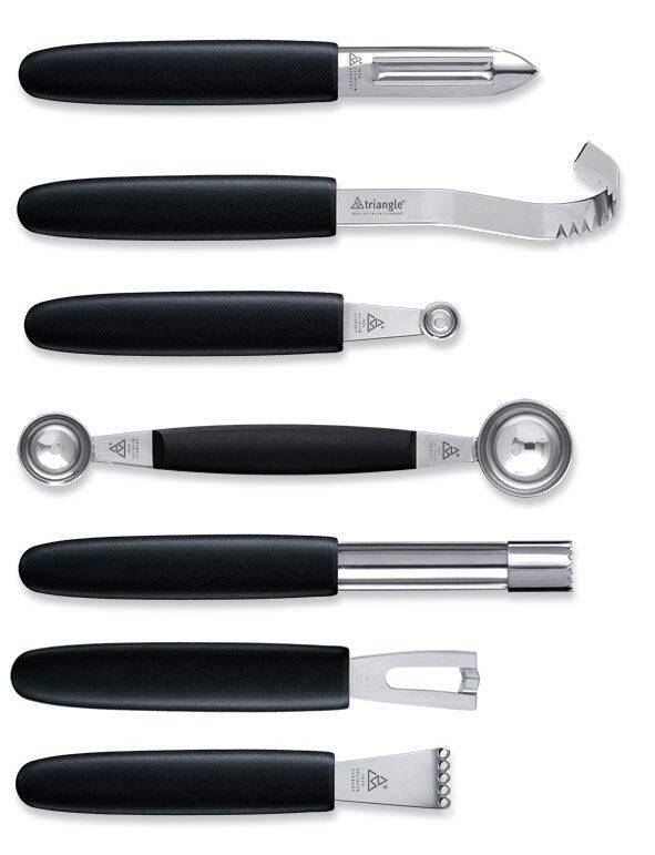Die Dekorierwerkzeuge von triangle bestehen aus gehärtetem Edelstahl und hochwertigem Polypropylen, das im vorderen Bereich mit rutschfestem Santoprene (einer Kautschuk-Legierung) überzogen wird. So bleiben die Schnitzmesser lange scharf.